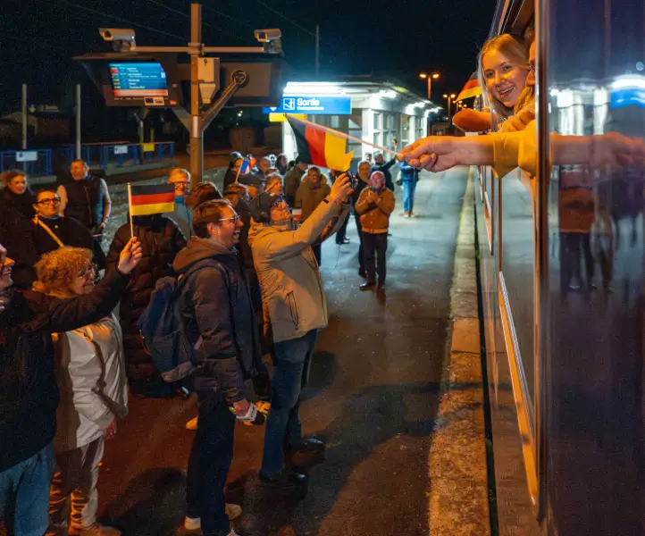 Die Strecke führt nordwärts durch Frankreich nach Belgien, mit Halt in Aulnoye-Aymeries, Mons, Brüssel und Lüttich, bevor der Zug über Nacht weiter in Richtung Berlin fährt. In Aulnoye-Aymeries gab es einen unerwarteten und besonderen Moment. Menschen aus der Stadt hatten sich auf dem Bahnsteig versammelt, mit französischen und deutschen Flaggen, und begrüßten den Zug bei seiner Ankunft. Reisende lehnten sich aus den Fenstern und winkten zurück. Eine kleine Geste, die vielen an Bord in Erinnerung blieb.